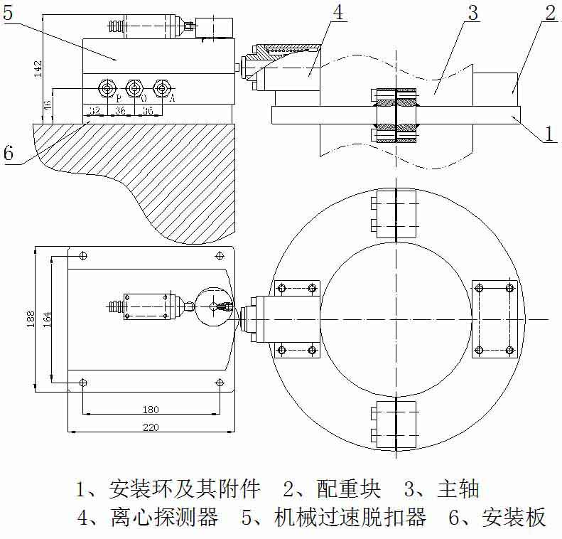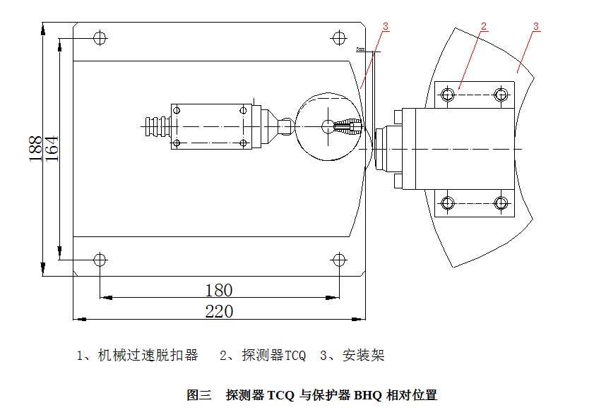 3、安裝過速保護器BHQ(由業(yè)主自己根據現(xiàn)場情況配裝,應有足夠的空間供保護器完成手動復位)及過速保護器BHQ的安裝螺栓不能完全緊固,以便于后面調整,安裝時要求液壓閥中心高度與過速探測器在同一高度,同時脫扣裝置的一邊與主軸中心線重合(如圖三),然后鎖緊螺栓。