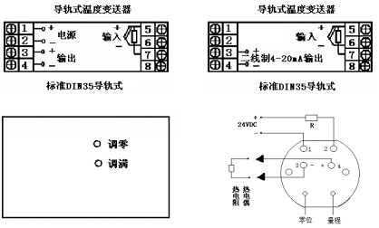 對導(dǎo)軌式溫度變送器輸入可以是熱電偶、熱電阻、標(biāo)準(zhǔn)信號。工作電源接端子1、24~20mA輸出信號接3正、4負(fù);對二線制4~20mA輸入信號正接5、負(fù)接6;熱電阻單端A5、并聯(lián)端B、C分別接67。