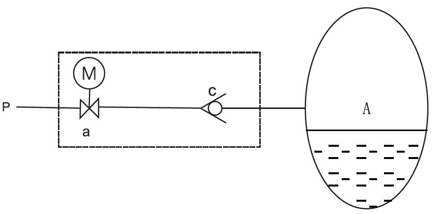 自動(dòng)補(bǔ)氣:當(dāng)自動(dòng)補(bǔ)氣條件滿足時(shí),關(guān)閉電動(dòng)球閥b,打開電動(dòng)球閥a,補(bǔ)氣過程:高壓氣氣源P→過濾器g→單向閥c→壓油灌A補(bǔ)氣。